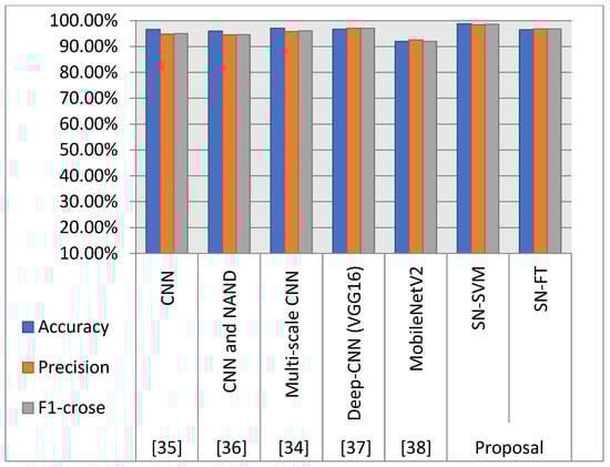 Table 5 compares our proposed method’s accuracy, precision, and F1-score with related work methods. As shown in Table 5, five approaches were used for the comparison, as recently described in the literature. The best results obtained were 97.00% accuracy, 95.80% precision, and 96.07% F1-score, by the multi-scale CNN approximation [35], which were superior to those of our proposed method (SN-FT). However, our second approach (SN-SVM) seems to exceed all of the methods, with 98.73% accuracy, 98.39% precision, and 98.56% F1-score.