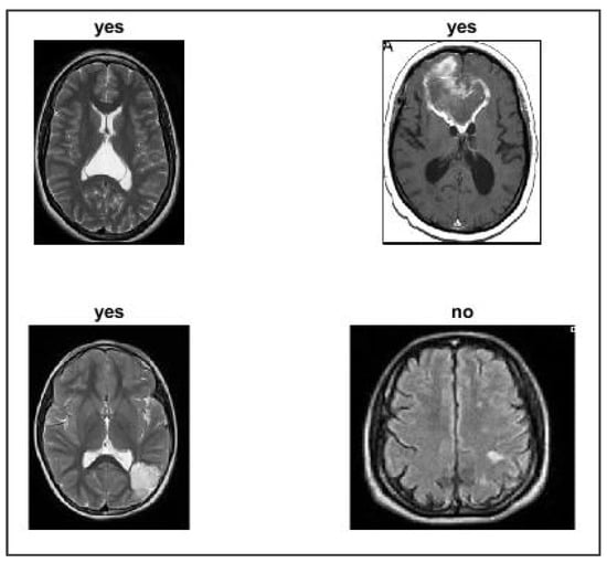 To validate the performance of the proposed multi-hybrid classification method, an additional benchmark dataset has been used in this section. We applied the MRI brain images dataset obtained from different patients gathered from several hospitals, WHO (World Health Organization), and the Whole Brain Atlas site, which was published by www.kaggle.com (website: https://www.kaggle.com/datasets/navoneel/brain-mri-images-for-brain-tumor-detection (accessed on 10 November 2022)). It contains 253 images, with 155 images of persons with brain tumours and 98 images of persons without brain tumours. Some sample images from the MRI brain dataset are shown in Figure 13.
