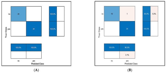 The results of CNN architecture (hybrid deep learning classification) based on combining the SqueezeNet technique with the SVM (SN-SVM) and Fine-Tuning (SN-FT) techniques is shown in the confusion matrices of the testing results of MRI brain images classified as having tumours or not-tumours in Figure 14.