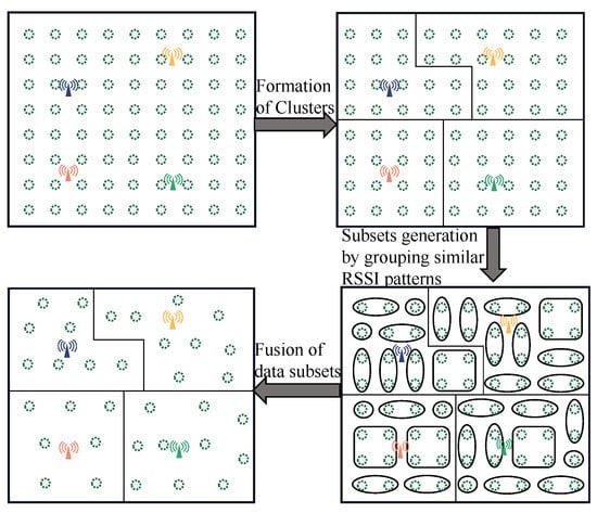 The whole working process when applying the clustering technique of this paper to the localization region of the 4 APs is shown in Figure 2. Either only one RP or multiple RPs are included in each generated subset. The introduced new parameter threshold (denoted as ) sets the upper limit of the Euclidean distance between each pair of RSSI-similar reference points that can be classified as a subset of the same cluster. After fusing the RPs of each subset, the fingerprint database construction is completed. The fingerprint of each subset comprises a representative RSSI vector of that subset and the location coordinates of all points in the subset. The RSSI of all reference points of the subset (such as kth subset in ith cluster) and their position coordinates are averaged and fused separately to obtain the representative RSSI vector. The estimation results of the representative RSSI vector and location coordinates of the subsets are shown below: