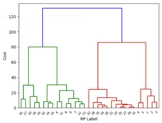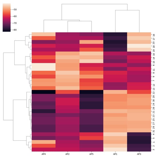 Figure 3 details the process of the designed clustering method. In the offline phase, all the pre-defined RPs are divided into clusters, and the cluster with the smallest distance is iteratively integrated into a new cluster. Figure 4 shows the heat map of hierarchical clustering, and the color shades in the figure represent the corresponding RSSI values.