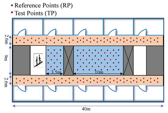 We have conducted extensive experiments in laboratories and corridors. The testing area is shown in Figure 5. After analyzing the characteristics of the indoor positioning space, the points are arranged with floor tiles at intervals and collected at each point. The Wi-Fi signal of stable and visible APs will improve the accuracy of fingerprint location results with the increase in the number of selected APs, but it is not infinite. Too many APs will cause mutual interference. Therefore, this paper selects six APs to ensure that the fingerprint reference point in the whole location area can receive Wi-Fi signals to the greatest extent. Then 30 points are randomly selected in the experimental area several times as test points to collect test data. The acquisition time of each reference point and test point is 5 min, and the refresh rate of the sampling equipment is 5 s.