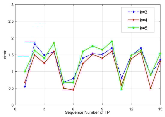 In this experiment, the weighted K-nearest neighbor algorithm (WKNN) is selected as the positioning algorithm, and the K values in the WKNN algorithm are 3∼5 for experiments, and the positioning errors of these several K values are analyzed. Figure 6 shows that when , most of the positioning error curves of the WKNN algorithm are below the positioning errors of other values. In other words, in the WKNN algorithm, the positioning effect is better when the K value is 4. Therefore, the value of K will be 4 to carry out the subsequent experiments.
