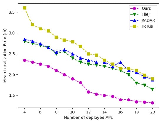 Figure 7 shows the mean localization error versus the number of deployed AP. When the number of AP increases, the localization error decreases because more APs help localize the target to a smaller area. The diminishing returns of adding additional APs are because the signal (or fingerprint) differentiation decreases when we add more APs to a fixed area. Our method achieves the highest accuracy due to the joint consideration of measurement noise and the use of efficient hierarchical clustering. The results show that our method essentially achieves the lowest error compared to other schemes because of the combination of measurement noise considerations and the use of efficient hierarchical clustering.