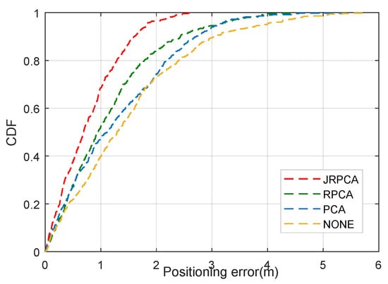 The fingerprint database is constructed based on original data; PCA algorithm, RPCA algorithm, and JRPCA algorithm are, respectively, used for localization experiments; and the positioning errors of the four fingerprint databases are compared. Figure 8 shows the cumulative distribution function (CDF) of positioning errors in the fingerprint database constructed based on different noise reduction algorithms. The experimental results show that the fingerprint database constructed based on the noise reduction algorithm in this paper is superior to those constructed by the other three algorithms in terms of performance, with of the points having a localization error of less than 1 m and of the points having a localization error of no more than 2 m.