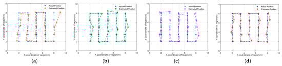 Figure 9 shows the trajectory of the localization results in a 10m×10m hall with the application of the four methods of this paper, Tilej, Radar, and Horus. The blue dots in the figure indicate the actual positions, and the asterisks indicate the estimated positions. During the experiments, initially, the accuracy of these methods was excellent at the localization points, but whenever steering was performed, the error increased, so that the localization accuracy of our method at the steering points was better than the other three methods. As shown in Table 1, among the position estimation of 25 points in the region, the maximum position estimation error of our method is 0.72 m, and the maximum position estimation errors of the other three methods are 1.13 m, 1.34 m, and 1.83 m, respectively. The experimental results show that the performance of the localization technique proposed in this paper is better than the other techniques considered in this paper.