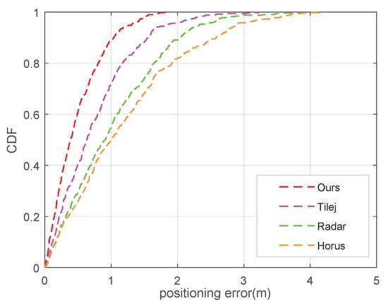 The distribution of localization errors for the four fingerprint techniques based on experiments with real indoor scenes is shown in Figure 10. Due to the complex indoor environment and large measurement noise, the accuracy of Radar is weakened by the scattered nearest neighbors. Horus assumes a certain distribution of signal level at each RP and therefore does not represent the true signal distribution with limited sampling. Therefore, the fingerprint data they collect in complex indoor environments such as lobbies and corridors are inaccurate, resulting in more scattered matching reference points. In contrast, this paper considers the influence of signal noise and adopts a robust noise suppression technique, which makes the RSSI data more accurate and effectively reduces the error in real indoor scenarios.
