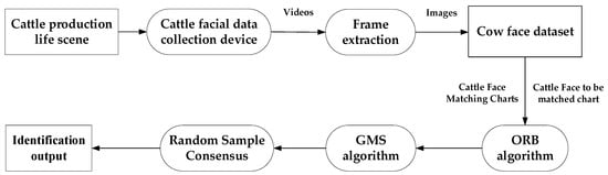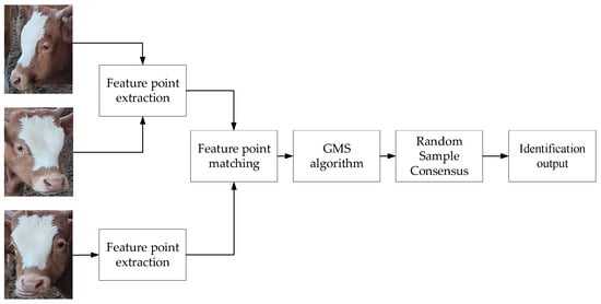 A two-branch matching algorithm for cattle identification is used. Image feature matching is a key technology in the field of computer vision and has been more widely used in the fields of visual SLAM (simultaneous localization and mapping) [17,18], 3D reconstruction [19], image retrieval [20], and visual tracking [21], and has been less used in individual recognition. Improving the robustness of image feature extraction and the accuracy and speed of feature matching is the focus of research in the field of image feature matching [22]. Taking the ORB algorithm as an example, feature matching is mainly divided into two steps. The first step extracts the feature points of the matched image and the image to be matched, respectively, and the feature points contain two parts: key points and descriptors. The key point is the position of the feature point in the image, and the descriptor contains the orientation of the key point and the surrounding pixel information. The second step compares the similarity of the feature points based on the information in the descriptors to determine the matching pair.