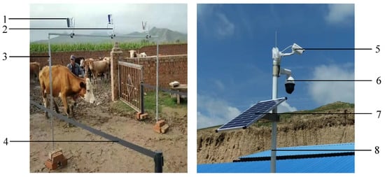 The data used in this study were obtained from the Heilinger Jiayu Breeding Cooperative in the Inner Mongolia Autonomous Region, as shown in Figure 1, with Simmental beef cattle and Holstein cows selected as data collection objects for video data collection. In order to enhance the credibility of the data and improve the quality of the data, a variety of methods were used to collect the data during data collection. On the one hand, raw video data from the cattle were captured manually by means of a capture device (a mobile phone or SLR camera) at a frame rate of 30 fps while the cattle were being fed. On the other hand, cameras were set up in the pasture to capture real-time facial data of cattle in production and living conditions. A total of 19 Simmental cows and 22 Holstein cows were collected, and the facial data were collected from multiple angles as experimental data. The cattle facial data collection device is shown in Figure 2, where the numbers one to seven represent: (1) a mobile phone, (2) a mobile phone stand, (3) a combined steel frame, (4) an isolation tape, (5) a webcam, (6) a spherical camera, (7) a solar panel., and (8) a support post.