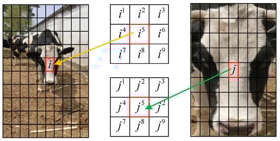 A pair of images containing the same target has feature correspondence. For a cow face object in an image, due to the continuity and homogeneity of the overall area change of the cow face, all points in the neighborhood of its corresponding feature point move with it, so that a correctly matched feature point pair (which can be called a principal homonymous point) has some other correct matching points within its neighborhood. As a support for the reliability of the primary homonym, these points in the neighborhood are called support points for the primary homonym. The GMS algorithm includes the information in the neighborhood of a feature point and uses a grid to count the number of support points in the neighborhood of the main homonym (i.e., the score), which is used to determine whether the match is correct or incorrect.