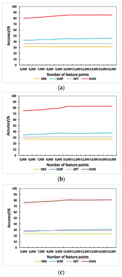 In order to exclude the impact of pixel differences on the experimental results, the image data resolution was processed to 640 × 480 (approximately 300,000 pixels) in conjunction with the actual pixel situation of the acquisition device during data collection. The number of feature points extracted was set to 10,000, taking into account the performance of all of the indicators of the experiment.