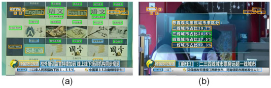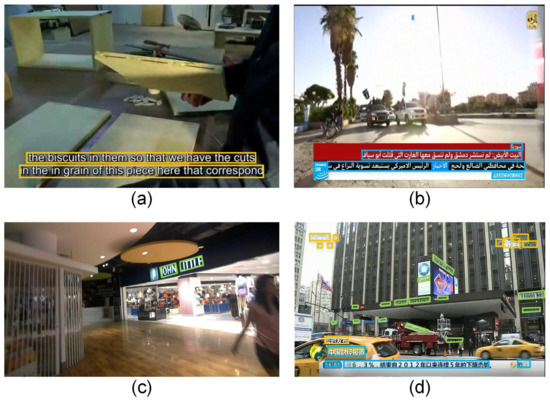 Overlaid text often appears in TV shows, movies, and news interviews to show characters’ dialogues and scene descriptions. Overlaid text detection faces many challenges including temporal diversity, complex backgrounds, similar colors, and low contrast. Tian et al. [5] established an overlaid text dataset that includes five web videos, i.e., Putin Speech, Curtains, Zippers, Wood Box, and Biscuit Joiner. The training set includes Putin Speech with 9839 frames and 14,492 ground truths. The test set consists of Curtains with 2760 frames and 3383 ground truths, Zippers with 5250 frames and 8520 ground truths, Wood Box with 4556 frames and 5661 ground truths, and Biscuit Joiner with 5265 frames and 9876 ground truths. Cai et al. [12] created a long-time overlay text dataset with three videos from TV dramas V1, V2, and V3. The training set includes V3 with 20,506 frames and 14,358 ground truths. The testing set consists of V1 with 18,415 frames and 12,975 ground truths, and V2 with 18,149 frames and 13,862 ground truths. Both of the above datasets focus on overlaid text detection.