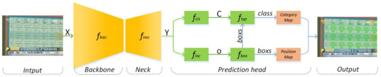 The generalized framework of the detection and classification network. It consists of three components, i.e., backbone, neck, and head. The backbone network () is used to receive the input image (X) and extract the image features from different scales. The neck stack () focuses on the fusing and re-treatment of the multiple-scale features and provides the combination features to the prediction head. The prediction head contains two branches. The upper branch predicts the category of text via and and the lower branch predicts the position of text via and (the same as the prediction head of the original detection algorithm). The final results comprise the position map and corresponding category map.