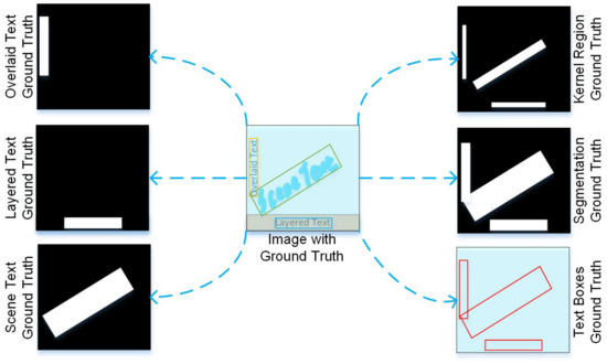 We designed two kinds of supervision labels, i.e., classification labels and localization labels, as shown in Figure 5. The comparison algorithms can be divided into regression-based methods and segmentation-based methods. The text box supervisions of the regression-based approaches can be normalized to the ground truth. The segmentation supervision of the segmentation-based approaches can be obtained by binarizing the regions inside and outside the text boundary. Some methods aim to segment adjacent texts accurately by shrinking the text region so we also generated the kernel region of a text instance by indenting the text region of the segmentation map. In order to conceal the differences among the different detectors, we designed a simple and effective classification strategy that represents the text types with separate activation maps. To this end, we obtained the corresponding supervision information of the overlaid text, layered text, and scene text by separating and binarizing the ground-truth map.