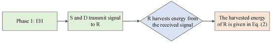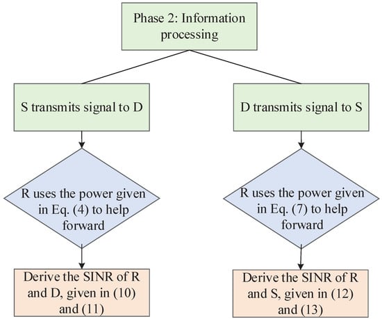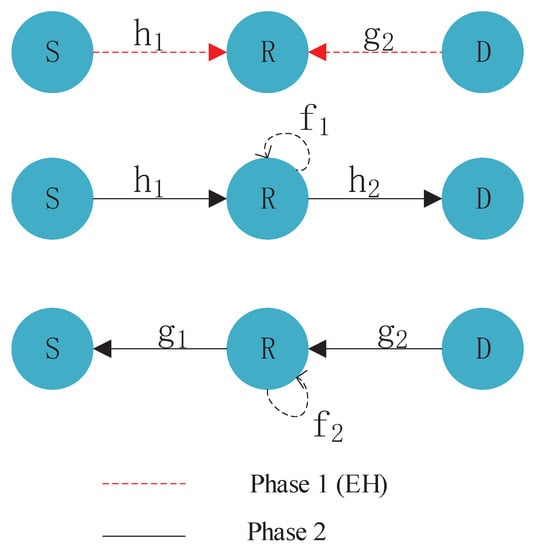 In this phase, S and D exchange their own information by R. Therefore, relay node R allocates a part of its harvested energy (in phase 1) to help S transmit the signal to D, and the remaining harvested energy of R is used to finish transmitting the signal from D to S. The intuitive information process is showed in Figure 3.