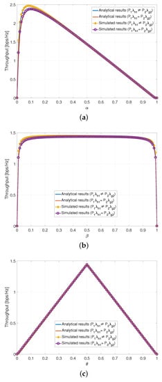 Figure 4a shows the system throughput as a function of when the other two parameters are set as and . For the analytical results of , we set W, W. We can observe that the biggest gap between the analytical throughput and the simulated throughput is when . For the analytical results of , we set W. The biggest gap between the analytical throughput and the simulated throughput is when . These results show that the analytical throughput reflects the practical throughput well. On the other hand, the system throughput first increases and then decreases as increases. This is because that when is too small, the harvested energy at R is not enough, so the transmitted energy for R is also not enough. When is close to 1, the harvested energy at R is large. However, the time for information transmission is reduced, which leads to a decrease in the system throughput, too.