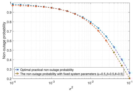 In fact, the non-outage probability is the key to obtain the system throughput. Figure 5 shows that the non-outage probability is related with SNR, and its value ranges from 0 to 1. The effect of noise power variation is equivalent to the effect of the transmission power variation, and it could be observed that the non-outage probability increases with the increases in SNR, i.e., the larger transmission power brings a larger non-outage probability. Meanwhile, Figure 5 shows that there is little gap between optimal non-outage probability and non-outage probability with fixed system parameters. Thus, we cannot optimize the non-outage probability alone, but should further consider optimizing the system throughput.