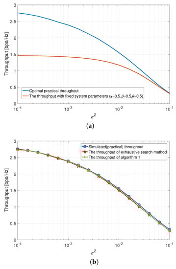 Optimal throughput as a function of noise power. (a) Optimal throughput vs. throughput with fixed system parameters. (b) The throughput obtained by different methods.