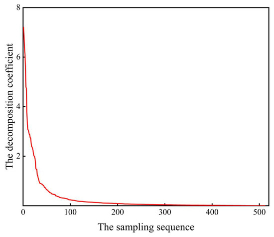 As shown in Figure 3, the distribution of the coefficients of the vibration signal transformed under the DCT orthogonal basis is arranged in descending order from the largest to the smallest in absolute value. As can be seen from the figure: the sparse coefficients of mechanical vibration signals under the DCT orthogonal basis all show an obvious trend of decay, and the slope of the coefficient decay curve decreases sharply and is close to zero after several experiments, so the experimental sparsity K is estimated to be 200. This experiment further verifies that the mechanical vibration signal is compressible under the DCT quadrature basis.