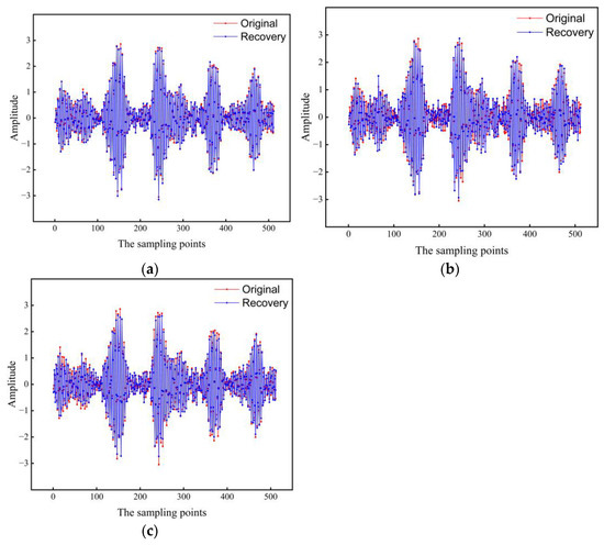 AOA-CS Algorithm to recover the mechanical vibration signal compared with the original vibration signal. (a) AOA-CS; (b) OMP; (c) BP.