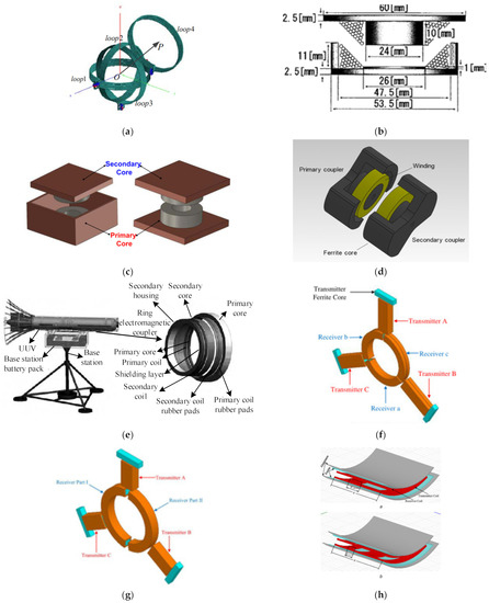 Types of electromagnetic couplers. (a) Three-phase coils; (b) Special electromagnetic coupler and tapered coils. (c) LCT semi-enclosed electromagnetic coupler; (d) PM type electromagnetic coupler. (e) Ring magnetic coupler; (f) Three-phase electromagnetic coupler; (g) Improved three-phase electromagnetic coupler; (h) Coiled coil electromagnetic coupler; (i) Dipole coil electromagnetic coupler.