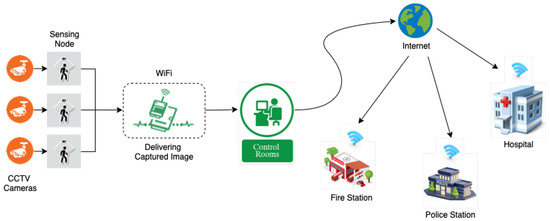 Most commercially available automatic systems currently use fixed closed-circuit television (CCTV) cameras [6], which enable the deployment of efficient identification and tracking algorithms, as shown in Figure 1. Following the acquisition of meaningful data by a CCTV camera, it is critical to ensure that the control room receives the same authentic data in order to take any action or send an alarm signal to various departments. Since there are several cameras, the system would generate a substantial number of redundant and unvaluable image data, which causes problems in looking for informative and valuable data from the stack of acquired data, as well as continual bandwidth loss [7]. The significance of the viewpoint also needs to be considered for the CCTV system. The quality of the generated image is largely determined by the angle of light, defining the viability of the visual task, and simplifying its performance. In short, visibility is essential for the sensor to recognize a feature [8].
