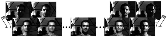 1. Figure 2 is the original image with an azimuth angle of +130° to −130°, the size is 640 × 480 pixels, and there are 28 people in files and 16,128 images in total. Each person has 9 poses, 64 images of environmental lighting changes, and a total of 576 images. The 9 postures include the following: posture 0 is the front posture; postures 1, 2, 3, 4, and 5 are about 12° from the camera’s optical axis (distance from posture 0); and postures 6, 7, and 8 are about 24° [30].