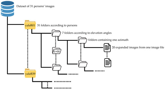 To briefly explain the rules of naming image names, the image name of yaleB01_P00A+000E+00 in Table 2 is used as an example: yaleB01 represents a person’s name, and the three capital English letters P, A, and E represent Posture, Azimuth, and Elevation, respectively. In this study, only one posture existed for every person, and thus Posture is recorded as P00.