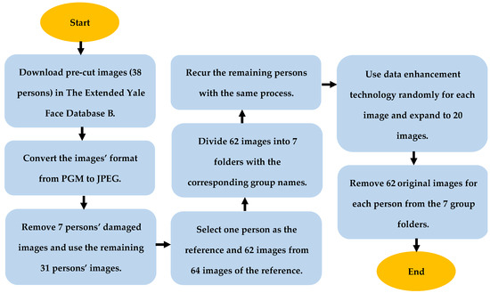 First, we downloaded 38 people’s pre-cut face images in The Extended Yale Face Database B data set from the website and converted the images’ format from PGM to JPEG for better image management. Among the downloaded images, 7 people’s images were partially damaged and removed, and the remaining 31 people’s images were applied in the research.