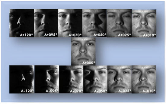 2. Figure 3 shows face images with an azimuth angle of +130° to −130°, all manually aligned, cropped, and adjusted to 168 × 192 pixels. There are 38 people in total and a total of 2432 images. There is only 1 posture for each person, 64 images of environmental lighting changes, and a total of 64 personal images. In this study, we used these face images for face recognition [31].