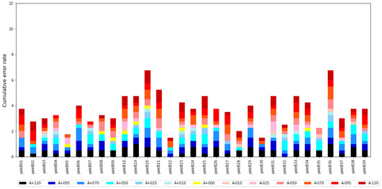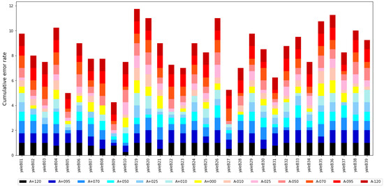 Figure 11 is a stacking diagram of OpenFace’s A+120--120E+00 grouping error rate comparison of different ambient light levels. The recognition error rates of the uppermost and the lowermost blocks are the highest, and they decrease as the azimuth angle approaches +000°. Overall, OpenFace’s recognition error rate was about 20% to 49% higher than LBPH’s in A+120--120E+00 grouped images.