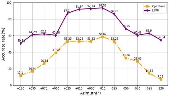 For the picture with A+000° as the center line, the recognition accuracy rate was almost symmetrical. There was not much difference between the light source on the left or the right. The closer the recognized azimuth angle was to azimuth +000°, the higher the recognition accuracy rate; the farther away the azimuth angle +000°, the lower the recognition accuracy rate. Overall, the recognition accuracy rate of LBPH under changes in environmental lighting was far better than that of OpenFace. Therefore, LBPH is more suitable for applications in environments with light changes. From Figure 12, whether LBPH or OpenFace was used at the azimuth angle of −010°, the recognition accuracy rate was the highest. LBPH was 34.68% more accurate than OpenFace at the azimuth angles of −010°. LBPH was 38.71% more accurate than OpenFace at the azimuth angles of +120°.
