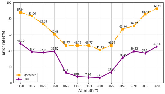 With A+000° as the center line, the recognition error rate was almost symmetrical. Overall, the recognition error rate of LBPH was much lower than that of OpenFace. When both azimuth angles were in the range of +25° to −25°, the recognition error rate was relatively low. When both azimuth angles were in the range of +50° to +120° and −50° to −120°, the recognition error rate was relatively high. For LBPH, when the azimuth angle was +50° to +25°, the identification error rate was reduced by 26.62%; when the azimuth angle was −50° to −25°, the identification error rate was reduced by 17.74%. For OpenFace, when the azimuth angle was +50° to +25°, the recognition error rate dropped by 13.71%; when the azimuth angle was -50° to −25°, the recognition error rate dropped by 20.17%. From the azimuth angle of +50° to +25° and −50° to −25°, we found that the recognition error rate was significantly reduced. This means that the change of the azimuth angle reduces the shadow on the face, and the contours of the facial features are clearer, reducing the error rate of face recognition.