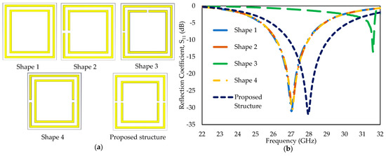 Before obtaining the final design of the unit cell, a study was conducted on a few ring resonators by keeping the area the same. All the shapes are 3.05 mm wide and 2.85 mm long. Among all designs, only five are shown in Figure 2a, with one of them being the proposed unit cell. All the shapes are composed of two rectangular metal resonators separated by 0.215 mm distance. The unit cells are simulated using two waveguide ports on both sides of the z-axes [shown in Figure 1c]; PEC and PMC are defined along x-axis and y-axis, respectively. The frequency responses () of different designs are shown in Figure 2b. Shape 1 consists of two conventional resonators without any splits and resonates at 26.8 GHz (black dotted curve in the figure). From Equation (10), it is obvious that a decrease in inductance/capacitance would shift the resonance to the higher frequency. Slits are introduced in each resonator to move the resonance to the higher frequency to 27 GHz. Shape 3 consists of the same split in each resonator but 90° apart. The inner ring is placed 90° from the outer one to create mutual coupling so that the resonance shifts to the higher frequency. Figure 2b shows that the structure operates at 31.3 GHz (which is above the desired 28 GHz 5G band). Shape 4 contains two single-split resonators that operate at 26.82 GHz placed 180° apart. Eventually the proposed shape contains two splits in both resonators with optimum coupling between the resonators to operate at 28 GHz (green dotted line in the figure) with a −10 dB bandwidth of around 2 GHz.