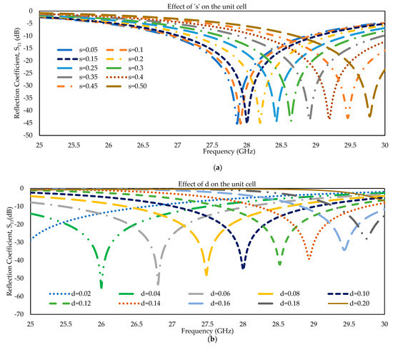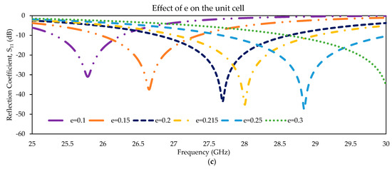 A parametric study of the proposed unit cell is conducted for the splits (denoted by ‘s’), width of the metal strips (denoted by ‘d’), and the distance between the resonators (denoted by ‘e’). It is evident from Figure 3 that these three parameters have significant impact on the structure to regulate its resonance frequency. Figure 3a exhibits the impact of splits on the resonance. When the split varies from 0.05 to 0.50 mm, the resonance frequency shifts from the lower frequency to the higher one. The structure operates at 28 GHz when the split is 0.15 mm wide.