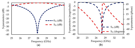 Figure 4a shows the reflection coefficient () and transmission coefficient () of the optimized unit cell, and Figure 4b shows the magnitude and phase behavior. It exhibits a −10 dB bandwidth of more than 2 GHz. The phase curve of the reflected wave crosses 0° at 28 GHz, at which the magnitude of is minimum (−38.73 dB).