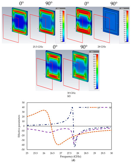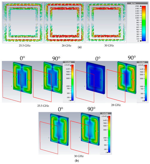 Figure 5b shows the electric field response, and Figure 5c shows the magnetic field phase response (0° and 90°) of the unit cell at 25.5, 28, and 30 GHz, respectively. It is obvious from Figure 5b that the electric field response of the unit cell at 28 GHz is higher than that at 25.5 and 30 GHz (non-resonance frequencies). However, the response is intense when the wave is being propagated at the 90° phase on the structure, which satisfies the condition of Maxwell’s equation where the surface current must be in-phase with the magnetic response and should be opposite to the electric field. Figure 5c confirms that the magnetic response is in-phase with the current flowing through the structure at 28 GHz, where it shows near-zero response at 90°.