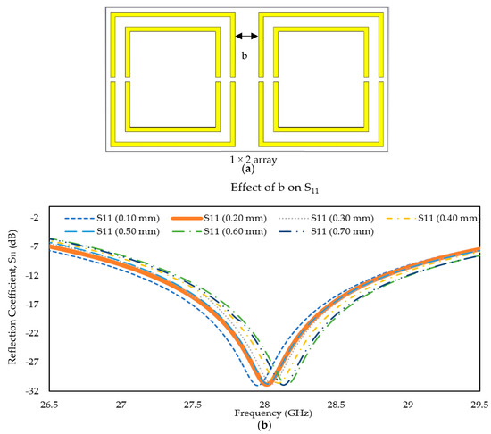 A comparative study is made on 1 × 2, 2 × 2, and 4 × 4 array configurations to validate the unit cell structure. Figure 6a shows the configuration of the 1 × 2 array where two unit cells are placed 0.20 mm (denoted by ‘b’) apart. Figure 6b shows the parametric study to determine the optimum distance for the unit cells. The study is performed for the distance from 0.10 mm to 0.70 mm, where the structure shows resonance at 28 GHz at 0.20 mm and 0.50 mm distance. However, the distance between the units is selected as b = 0.20 mm to make the overall structure compact, and at this distance (0.20 mm) the structure exhibits slightly higher bandwidth than that at 0.50 mm.