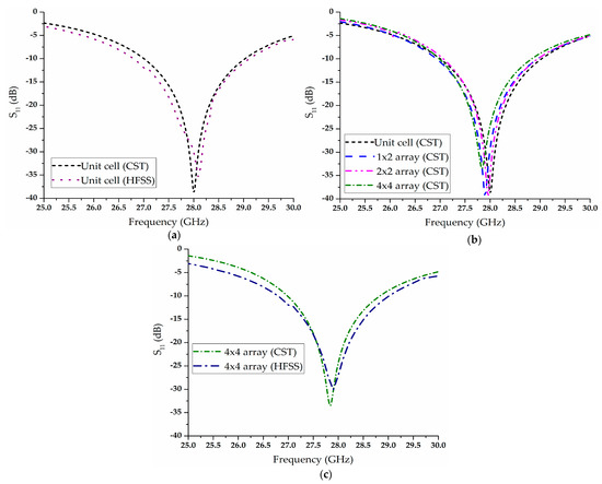 The same process is followed to design 2 × 2 and 4 × 4 arrays. The magnitude of these arrays with the unit cell is shown in Figure 7a. All the arrays operate at 28 GHz indicating the accuracy of the unit cell simulations. The unit cell and 4 × 4 array configurations are further simulated in finite-element-method (FEM)-based high-frequency simulation software (HFSS) to validate its result. The result from HFSS shows good agreement with those obtained from CST. This study also confirms that arrays of this unit cell can be used in developing metamaterial-based FSSs, electromagnetic absorbers, filters, super lenses, etc.