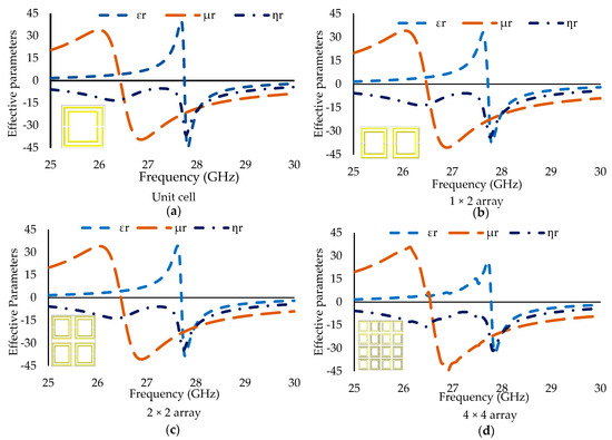 Figure 8 shows a comparative analysis of effective dielectric parameters between unit cell and array configurations. Similar NRW and direct retrieval methods are used to extract the values of these parameters. Figure 8 shows the results within the frequency range of 25 to 30 GHz, where the structure exhibits DNG properties for all the configurations. The unit cell shows negative effective permittivity (within 25 to 30 GHz) from 27.475 GHz to 30 GHz with a minimum value of −48.22. The array configurations follow the trend of the unit structure with a slight shift in frequencies. In the case of the 1 × 2 array, the range is from 27.725 to 30 GHz, with a minimum value (PMV) of −38.10; for the 2 × 2 array, the range is from 27.705 to 30 GHz, with a PMV of −38.55; and for the 4 × 4 array, it is from 27.78 to 30 GHz, with a PMV of 33.20. The arrays exhibit similar agreement in other effective dielectric parameters (effective permeability and refractive index). Table 3 summarizes these parameters for different arrays. It is evident from Table 3 that all the configurations show negative values of the effective dielectric parameters within the frequency range of 25 to 30 GHz (including the resonance frequency), which further validates that the structure is a DNG metamaterial at 5G mmWave frequency (28 GHz).