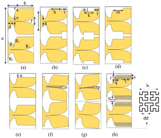 The 1 × 2 Coplanar Vivaldi Antenna of (a) Regular Palm Tree (RPT-CVA), (b) Front Cut Palm Tree (FCPT-CVA), (c) Middle Cut Palm Tree (MCPT-CVA), (d) Back Cut Palm Tree (BCPT-CVA), (e) Complete Cut Palm Tree (CCPT-CVA), (f) Left Tilt Palm Tree (LTPT-CVA), (g) Right Tilt Palm Tree (RTPT-CVA), (h) Hilbert Fractal Structure Palm Tree (HFSPT-CVA).