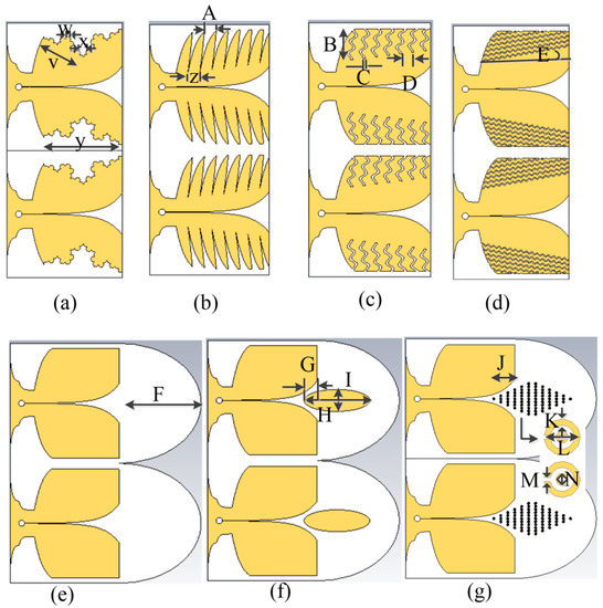 The 1 × 2 MIMO Coplanar Vivaldi Antenna of (a) Koch Fractal Structure Palm Tree (KFSPT-CVA), (b) Exponential Slot Edge Palm Tree (ESEPT-CVA), (c) Vertical Wave Structure Palm Tree (VWPT-CVA), (d) Horizontale Wave Structure Palm Tree (HWPT-CVA), (e) Regular Lens Palm Tree (RLPT-CVA), (f) Elips Lens Palm Tree (ELPT-CVA), (g) Metamaterial Lens Palm Tree (MLPT-CVA).
