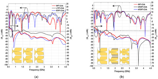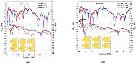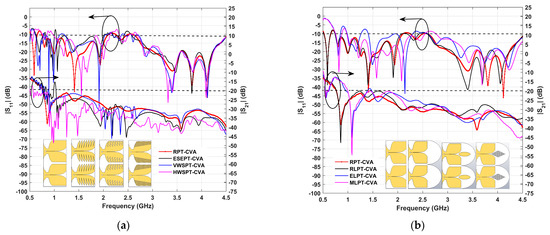 The performance of S11 and S21 for RPT, ESEPT, VWSPT, and HWSPT is shown in Figure 5a. We can see that the best S11 performance is found for RPT. However, ESEPT, VWSPT, and HWSPT have S11 of more than −10 dB in some low frequencies. At 0.5 GHz ESEPT has S11 −16.859 dB but at 0.517 GHz to 0.628 GHz. it has an S11 of more than −10 dB as well as the structure of VWSPT and HWSPT.