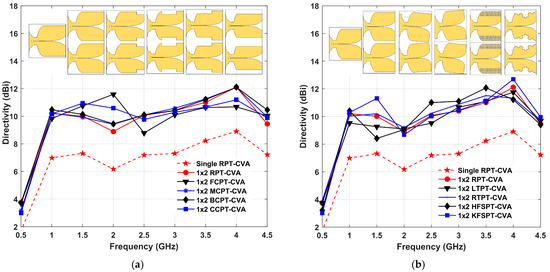 Directivity of: (a). Single and 1 × 2 Regular Palm Tree (RPT-CVA), 1 × 2Front Cut Palm Tree (FCPT-CVA), 1 × 2 Middle Cut Palm Tree (MCPT-CVA), 1 × 2 Back Cut Palm Tree (BCPT-CVA), 1 × 2 Complete Cut Palm Tree (CCPT-CVA) and (b). Single and 1 × 2 of Regular Palm Tree (RPT-CVA), 1 × 2 Left Tilt Palm Tree (LTPT-CVA), 1 × 2 Right Tilt Palm Tree (RTPT-CVA), 1 × 2 Hilbert Fractal Structure Palm Tree (HFSPT-CVA), 1 × 2 Koch Fractal Structure Palm Tree (KFSPT-CVA).