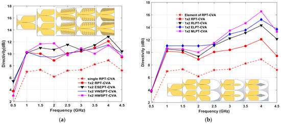 Directivity of (a). Element and 1 × 2 Regular Palm Tree- (RPT-CVA), 1 × 2 Exponential Slot Edge Palm Tree (ESE-CVA), 1 × 2 Vertical Wave Structure Palm Tree (VWPT-CVA), 1 × 2 Horizontale Wave Structure Palm Tree (HWPT-CVA), and (b). Element and 1 × 2 Regular Palm Tree-Coplanar Vivaldi Antena (RPT-CVA), 1 × 2 Regular Lens Palm Tree (RLPT-CVA), 1 × 2 Elips Lens Palm Tree (ELPT-CVA), And 1 × 2 Metamaterial Lens Palm Tree (MLPT-CVA).