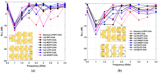 Figure 8a shows the Side Lobe Level (SLL) of element RPT, 1 × 2 of RPT, 1 × 2 of FCPT, MCPT, BCPT, CCPT, LTPT, RTPT, and HFSP. Meanwhile, Figure 8b presents the SLL of element RPT, SLL 1 × 2 of RPT, 1 × 2 of KSPT, ESEPT, VWSPT, HWSPT, RLPT, ELPT, and MLPT-CVA. From the simulation result, It shows that the best SLL performance is reached for RPT of 11.94 dB at 1 GHz, followed by 1 × 2 HFSPT of 10.357 dB at 3 GHz. Furthermore, most antennas have an SLL greater than −5 dB at frequencies above 1.5 GHz. Although mutual scaring parameters of the antenna at high frequencies are good, it produces a high-level sidelobe. This is because the higher the frequency, the greater the distance between the elements relative to the wavelength, therefore, the grating lobe will occur, enlarging the SLL However the SLL of a single element of RPT is better than others at frequency 2, 2.5, 3.5 and 4 GHz. But at frequency 1.5 GHz shows that 1 × 2 RPT has better performance of SLL than a single element. For wideband antennas, by arranging the antennas into MIMO, the sidelobe level performance can increase at low frequencies but at high frequencies, the SLL performance decreases due to the presence of grating lobes because the distance between elements becomes greater. Figure 8b shows that the 1 × 2 ELPT got the best SLL performance at 1 GHz of −13.757 dB. At 2 GHz, the 1 × 2 KFSPT results in the best performance of SLL of −9.426 dB. Meanwhile, at 2 GHz, the worst SLL of −0.677 dB was obtained for RPT. This means an SLL improvement of 8.749 dB between 1 × 2 KFSPT and 1 × 2 RPT. The best SLL of −6.89 dB was obtained at 2.5 GHz for 1 × 2 MLPT, while at 4 GHz, the 1 × 2 ELPT has the best performance of −4.688 dB. SLL performance can also be improved by adding a structure and lens at both antenna heights.