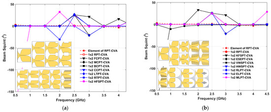 Beam Squint Performance of (a) Element and 1 × 2 Regular Palm Tree (RPT-CVA), 1 × 2 Front Cut Palm Tree (FCPT-CVA), 1 × 2 Middle Cut Palm Tree (MCPT-CVA), 1 × 2 Back Cut Palm Tree (BCPT-CVA), 1 × 2 Complete Cut Palm Tree (CCPT-CVA), 1 × 2 Left Tilt Palm Tree (LTPT-CVA), Right Tilt Palm Tree (RTPT-CVA), 1 × 2 Hilbert Fractal Structure Palm Tree (HFSPT-CVA), and (b). Element and 1 × 2 Regular Palm Tree (RPT-CVA), 1 × 2 Koch Fractal Structure Palm Tree (KFSPT-CVA), 1 × 2 Exponential Slot Edge Palm Tree (ESEPT-CVA), 1 × 2 Vertical Wave Structure Palm Tree (VWSPT-CVA), 1 × 2 Horizontale Wave Structure Palm Tree (HWSPT-CVA), 1 × 2 Regular Lens Palm Tree (RLPT-CVA), 1 × 2 Elips Lens Palm Tree (ELPT-CVA), and 1 × 2 Metamaterial Lens Palm Tree (MLPT-CVA).
