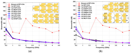 Beamwidth of (a). Element and 1 × 2 Regular Palm Tree (RPT-CVA), 1 × 2 Front Cut Palm Tree (FCPT-CVA), 1 × 2 Middle Cut Palm Tree (MCPT-CVA), 1 × 2 Back Cut Palm Tree (BCPT-CVA), 1 × 2 Complete Cut Palm Tree (CCPT-CVA), 1 × 2 Left Tilt Palm Tree (LTPT-CVA), 1 × 2 Right Tilt Palm Tree (RTPT-CVA), 1 × 2 Hilbert Fractal Structure Palm Tree (HFSPT-CVA), and (b). Element and 1 × 2 Regular Palm Tree (RPT-CVA), 1 × 2 Koch Fractal Structure Palm Tree (KFSPT-CVA), 1 × 2 Exponential Slot Edge Palm Tree (ESEPT-CVA), 1 × 2 Vertical Wave Structure Palm Tree (VWSPT-CVA), 1 × 2 Horizontale Wave Structure Palm Tree (HWSPT-CVA), 1 × 2 Regular Lens Palm Tree (RLPT-CVA), 1 × 2 Elips Lens Palm Tree (ELPT-CVA), and 1 × 2 Metamaterial Lens Palm Tree (MLPT-CVA).