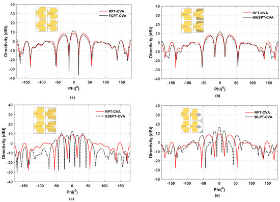 Radiation Pattern in the E-Plane of (a). RPT-CVA vs FCPT-CVA at 2 GHz, (b). RPT-CVA vs HFSPT-CVA at 2 GHz, (c) RPT-CVA vs ESE-CVA at 4 GHz, and (d). RPT-CVA vs MLPT-CVA at 4 GHz.