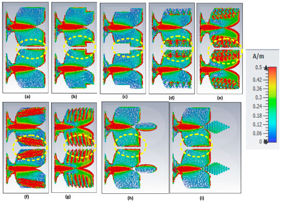 Surface current performance of (a) Regular Palm Tree (RPT-CVA), (b) Front Cut Palm Tree (FCPT-CVA), (c) Back Cut Palm Tree (BCPT-CVA), (d) Hilbert Fractal Structure Palm Tree (HFSPT-CVA), (e) Vertical Wave Structure Palm Tree (VWSPT-CVA), (f) Horizontale Wave Structure Palm Tree (HWSPT-CVA), (g) Exponential Slot Edge Palm Tree (ESEPT-CVA), (h) Elips Lens Palm Tree (ELPT-CVA), and (i) Metamaterial Lens Palm Tree (MLPT-CVA).